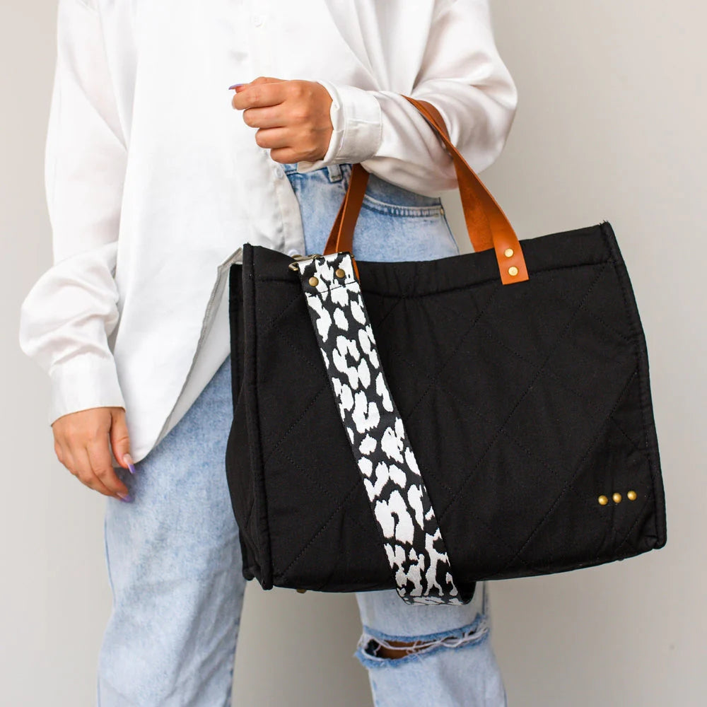 Bring a touch of style to any outfit with our Carrie Canvas Crossbody tote! Crafted from black quilted cotton and featuring a zipper top closure and magnetic top closer, it's designed to make a statement. Plus, with an inner pocket and removable strap, it's as practical as it is fashionable. Don't miss out!