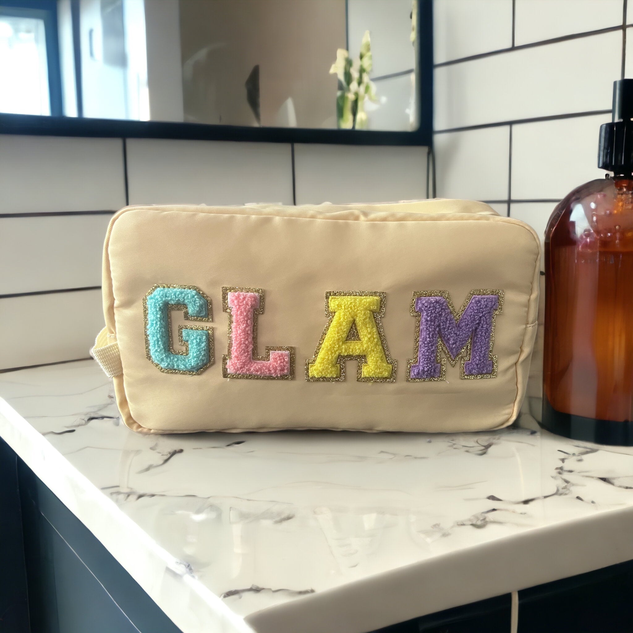 Experience the height of glamour with our Glam Chenille Patch bag! This bag is built with superior water resistance material to protect all of your makeup products! Keep your beauty essentials safe, secure and always at hand with this stylish and functional accessory!